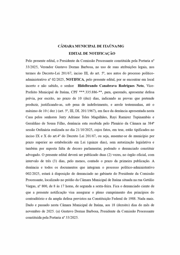 A Comissão Processante, que trabalha para uma possível cassação do vice-prefeito Hildebrando Canabrava, que desde de setembro não se apresenta para trabalhar na Prefeitura de Itaúna, e é considerado foragido pela Polícia Federal, fez publicar edital de Notificação, já que Neto não tem endereço conhecido no momento. Neto não teve licença do Legislativo para se ausentar do trabalho e segundo a PF, que investiga irregularidades em documentações de licenças ambientais para mineradoras no estado de Minas Gerais, era peça fundamental nas negociações irregulares entre a fiscalização do Governo do Estado e empresários.