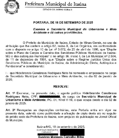 A Prefeitura Municipal de Itaúna vem a público esclarecer, diante das recentes notícias veiculadas na mídia, envolvendo o nome do vice-prefeito e Secretário Municipal de Meio Ambiente, Sr. Hidelbrando Canabrava Rodrigues Neto, que os fatos noticiados não guardam qualquer relação com o exercício de suas funções públicas municipais, seja como vice-prefeito, seja como titular da referida pasta.