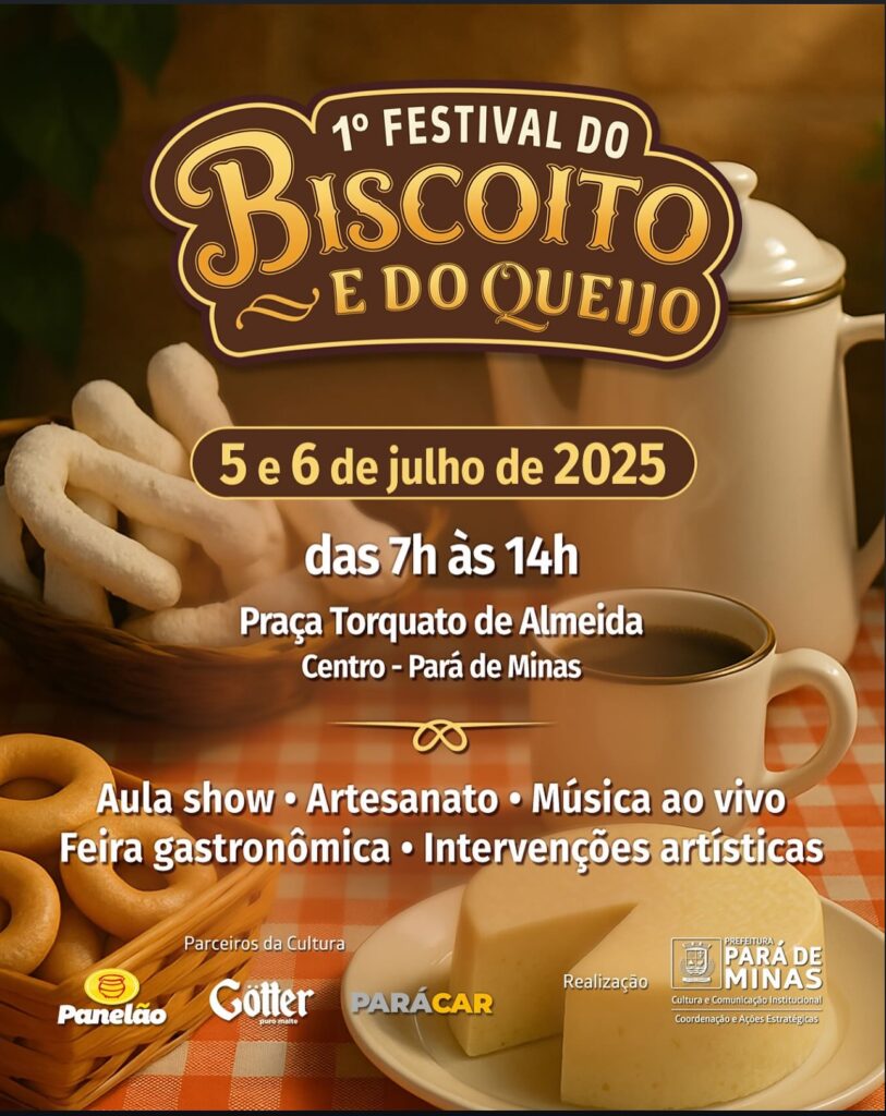 Pará de Minas prepara para o fim de semana, dias 5 e 6 de julho, sábado e domingo, o 1º Festival do Biscoito e do Queijo! Durante dois dias a cidade vai celebrar os sabores, os saberes e a cultura da nossa terra e ainda ensinar receitas de biscoitos tradicionais das suas quitandeiras.